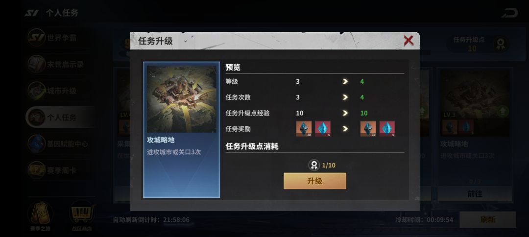 ⑨攻城略池建议升到3级,3次正好是S1赛季初每个盟1天可以宣战的上限。不过本人经常出现刷出这个任务的时候不打城,打城时却没有这个任务的情况,希望小伙伴们运气比我好。