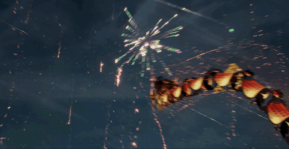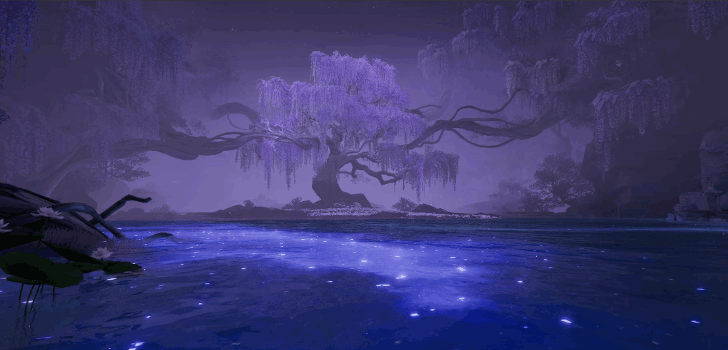 为了强调流动感,我们还设计了月华自天穹流淌至诡市的奇观表现。仙长在入口栈道处驻足看到的大片荧光海,正是沿着山体滴下来的月浆汇聚。