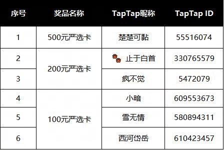由于TapTap无法进行私聊,请获奖的灵兽师们在6月1日前(5月31日23:59结束,逾期视为自动放弃)加入qq社群【833242091】,并私聊群主提供活动链接、TapTap个人资料页面截图、TapTapID,核实无误后即可领取严选卡奖励!