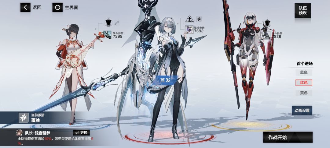 ②覆冰:赛琳娜·希声(黄位,队长,首发,输出),万事·明晰梦(红位,启动),亚里莎·回音(蓝位)