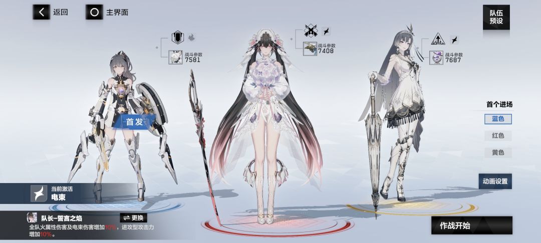①电束:露西亚·誓焰(红位,队长,输出),莉莉丝·谬影(黄位,启动),七实·芒星之迹(蓝位,首发)