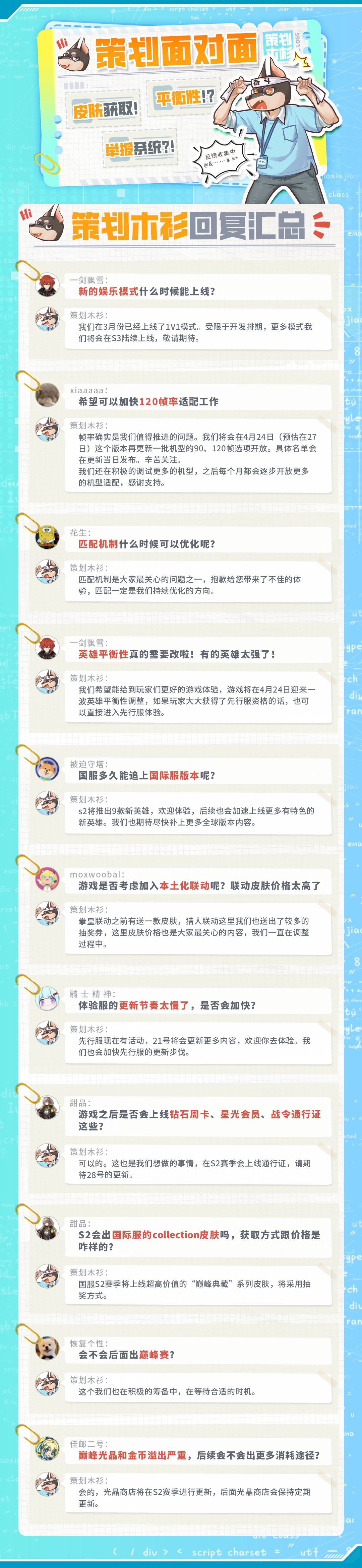 在S1期间,我们收到了许多玩家大大的宝贵建议,我们将会在4.18日邀请决胜巅峰策划统一给到玩家们回复!