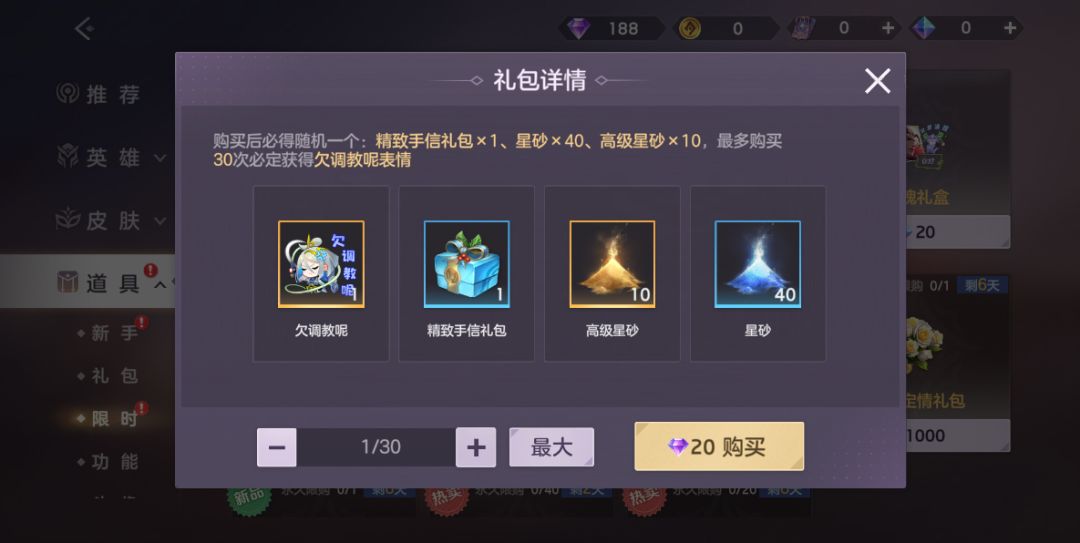 3款表情礼盒限时特卖!消耗钻石即可抽取表情“欠调教呢”、表情“YYDS”、表情“谁懂啊”及精致手信礼包、、高级星砂、星砂等奖励,每款礼盒最多30抽必得限定表情!