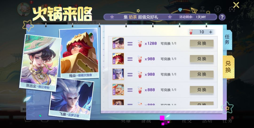 完成任务、商城购买收集奶茶,即可兑换传说皮肤张出尘·临江寻粉,史诗皮肤华佗·热辣川锅、梅朵·萌萌大怪兽、飞廉·云梦之歌、马可波罗·汉姆堡哥、洛克·热量炸弹等丰富好礼。