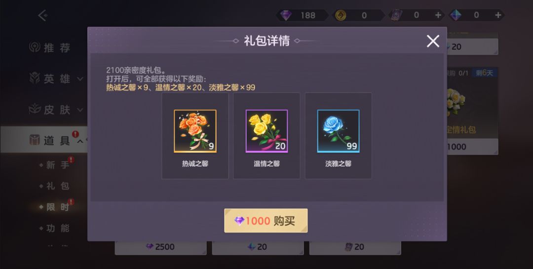 钻石定情礼包、钻石挚爱礼包限时售卖!使用钻石即可购买。钻石挚爱礼包内含浓意之馨*9、热诚之馨*5、温情之馨*1(全部赠予好友可获得5200亲密度);钻石定情礼包内含热诚之馨*9、温情之馨*20、淡雅之馨*99(全部赠予好友可获得2100亲密度)。