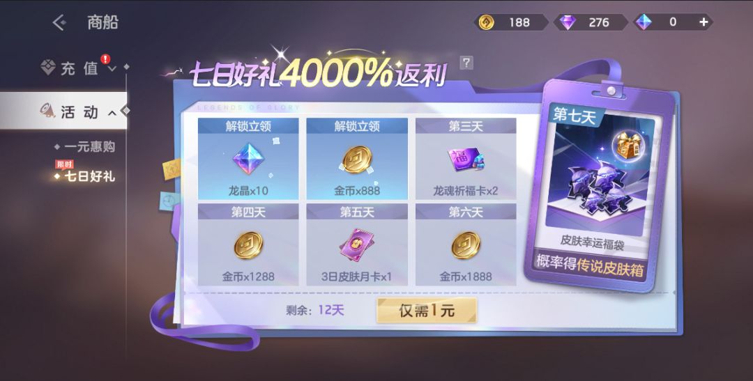 仅需1元解锁登录活动,可获得龙晶*10、龙魂祈福卡、3日皮肤月卡等奖励。累计登录7天后随机获得传说皮肤自选箱、皮肤碎片*10中的任一奖励。