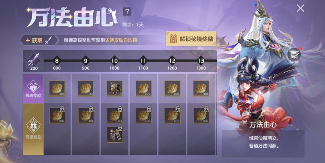 完成任务提升等级可免费获得英雄碎片、3天满级星盘特权卡等奖励;付费30元可得史诗皮肤自选箱、皮肤碎片,史诗皮肤自选箱内含女魃·冷月映蝶、嫦娥·离火绯花、约修亚·云栖鹤鸣、精卫·绒狼之森;付费98元可额外获得传说皮肤自选箱等奖励,传说皮肤自选箱内含诸葛亮·太微星尊、露西亚·堕落天使、夏尔美·海洋奇缘、梅林·神隐千山。