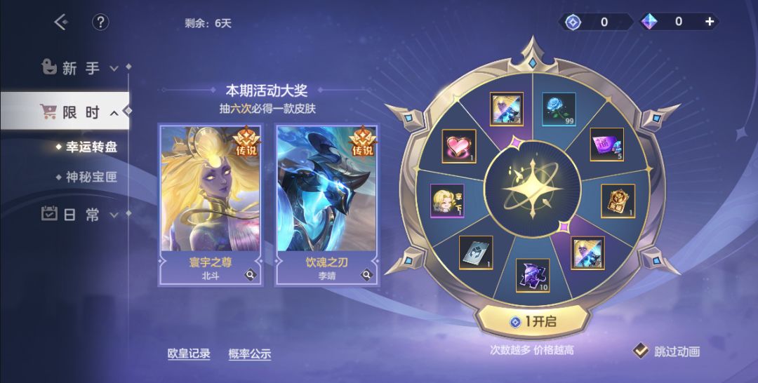 使用龙晶购买幸运币进行抽奖。李靖·饮魂之刃、北斗·寰宇星尊、幸运星英雄自选箱、拿下表情、龙魂祈福卡、皮肤碎片、改名卡、好感度礼包等奖励等你来抽!最多6抽获得一款皮肤,最多9抽可获得全部奖励,前2抽抽到皮肤的守护者会获得“欧皇”称号。