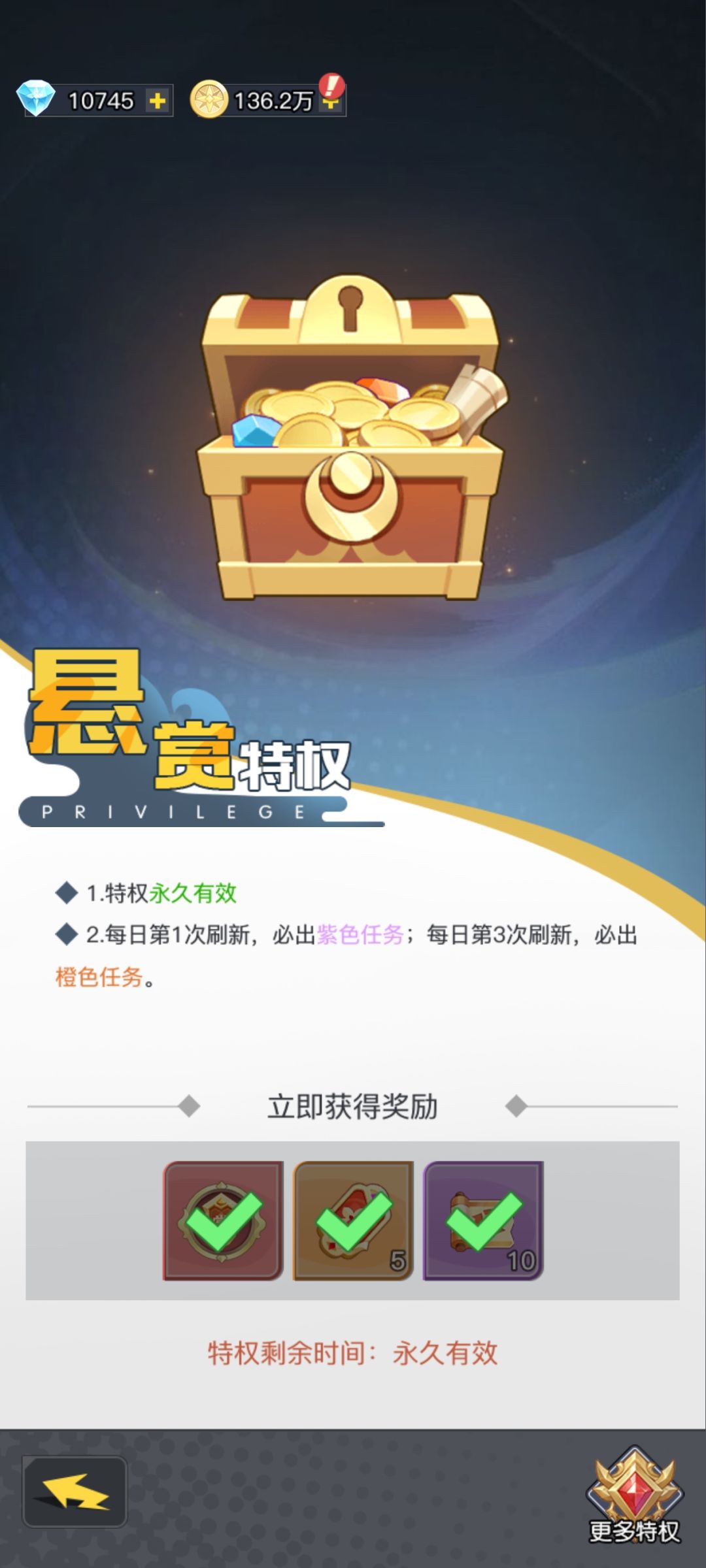 ✅️悬赏:前期把悬赏特权买了,保证利益最大化。刷新只要紫色、橙色,红色。如果实在没有其他的就选蓝的。