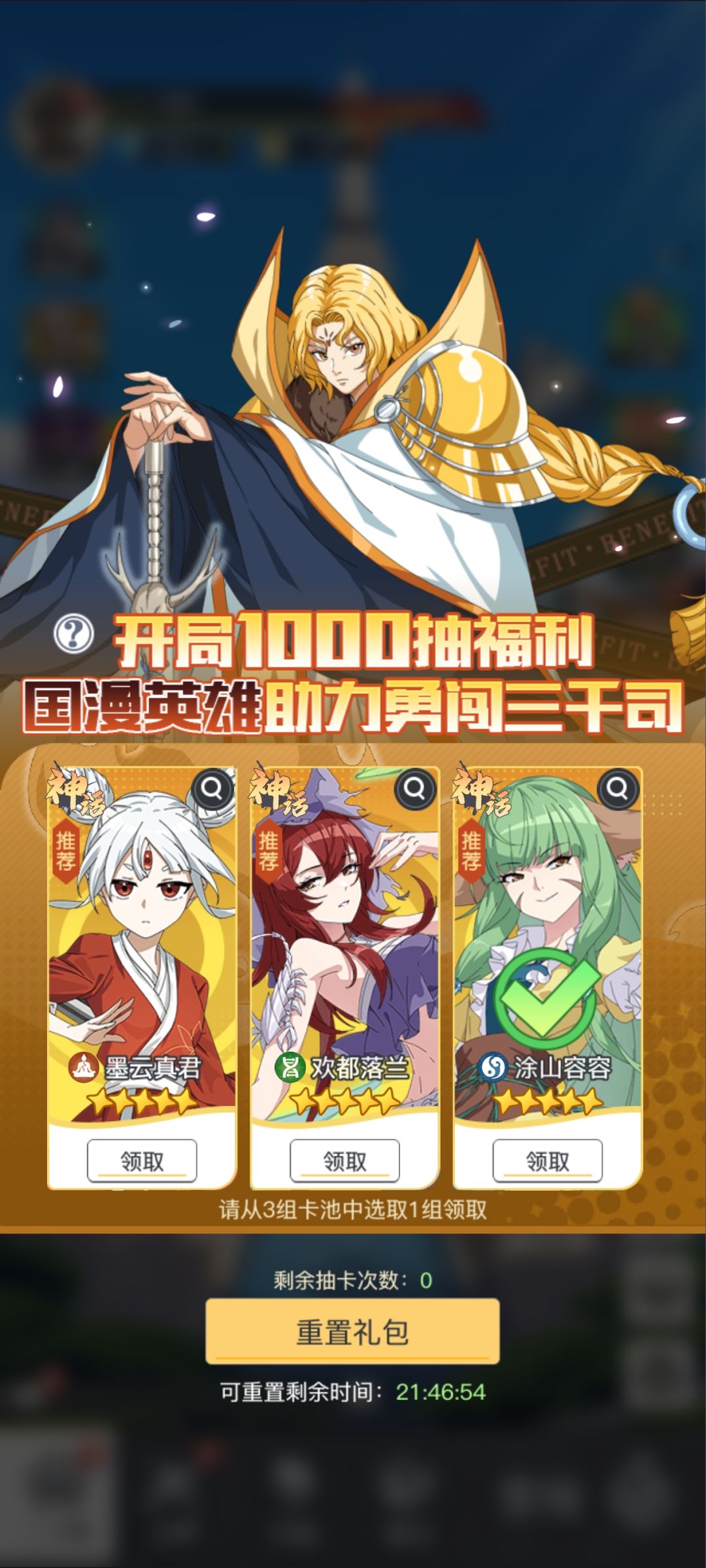 5、这个1000抽自选很重要,千万不要选错。目前这里我推荐选涂山容容(如果你抽出来了就建议选择欢都落兰这样活动送一个基本可以6星)