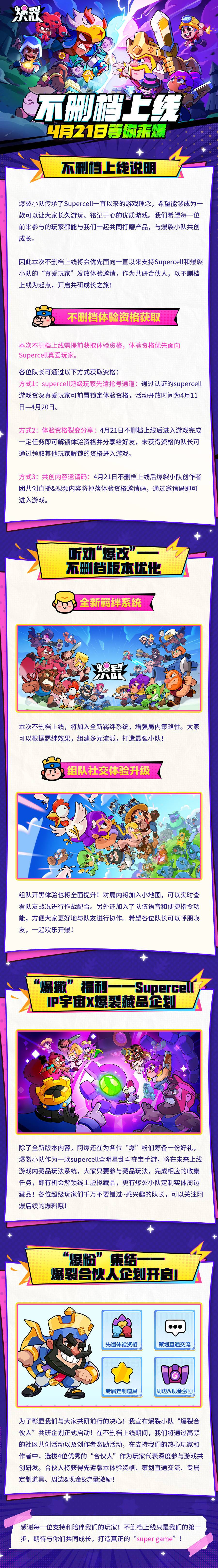 本次不删档上线将会优先面向一直以来支持Supercell和爆裂小队的“真爱玩家”发放资格,作为共研合伙人开启共研成长之旅!目前supercell超级玩家专属资格邀请通道现已开启,赶快来验证锁定资格吧!
