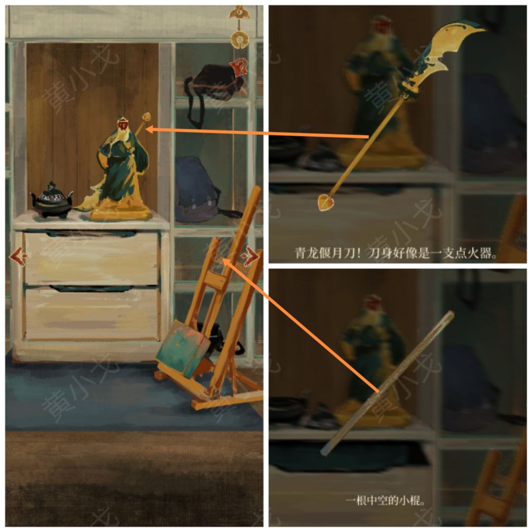 1.点击拾取关公像手中的【青龙偃月刀】;画架上的【小棍】