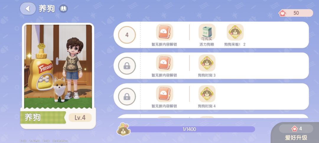 4级解锁的活力狗粮100精力一个,1级直升4级需要60袋