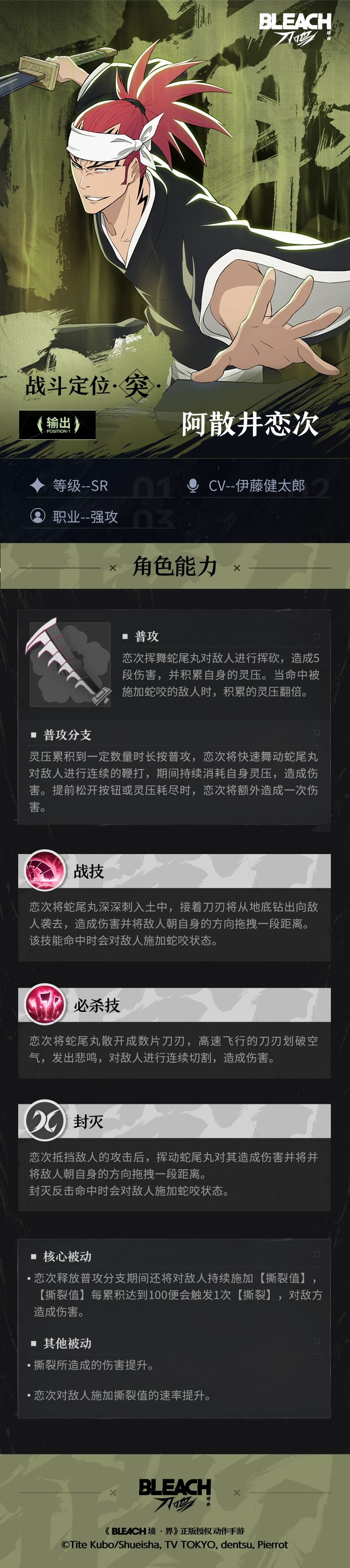 兴趣是收集护目镜。游戏中的恋次是一名中距离范围输出角色,攻击时可高频触发撕裂伤害,而且有一定聚怪控制能力,在对群输出时有不俗的优势,是非常可靠的队友。一起来看看恋次的技能吧!