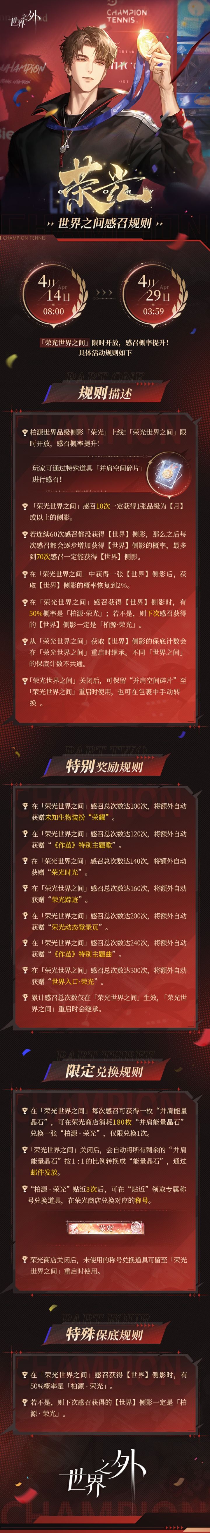 4月14日08:00-4月29日03:59,「荣光世界之间」限时开放,感召概率提升!具体活动规则如下:
