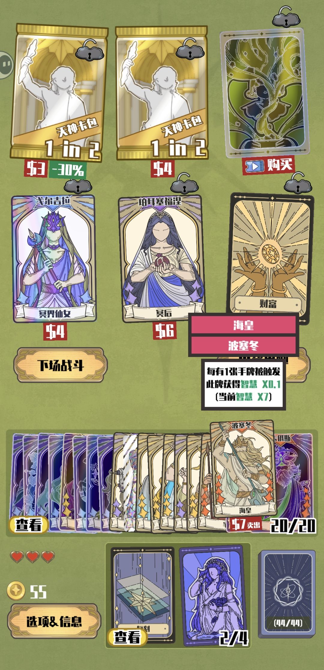 之前存档删了,然后重新玩重新抽的卡组,大天神里也是近期才抽到海王,也没抽到回声或者海后,冥王也还没入到,贸易神也是最近才开出来