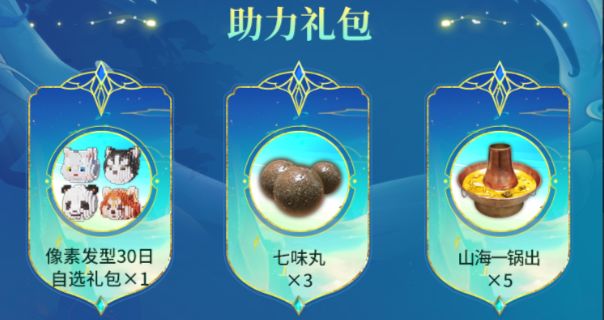 除此之外,活动期间完成助力还可免费领取像素发型30日自选包,七味丸x3,山海一锅出x5;