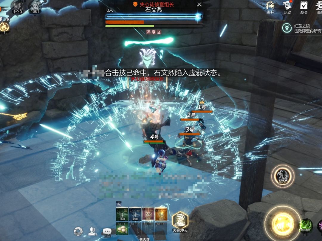 b. 同样拥有"合击"和"格挡"机制,务必注意合击提示,在进行合击的时候会有明显的蓝色光圈范围,合击请务必站在蓝色光圈范围内进行合击(若武器存在双控,也可以帮队友控一下,以便补充队友没有能及时回到光圈)。未成功合击时迅速远离BOSS,避免受到高额伤害。