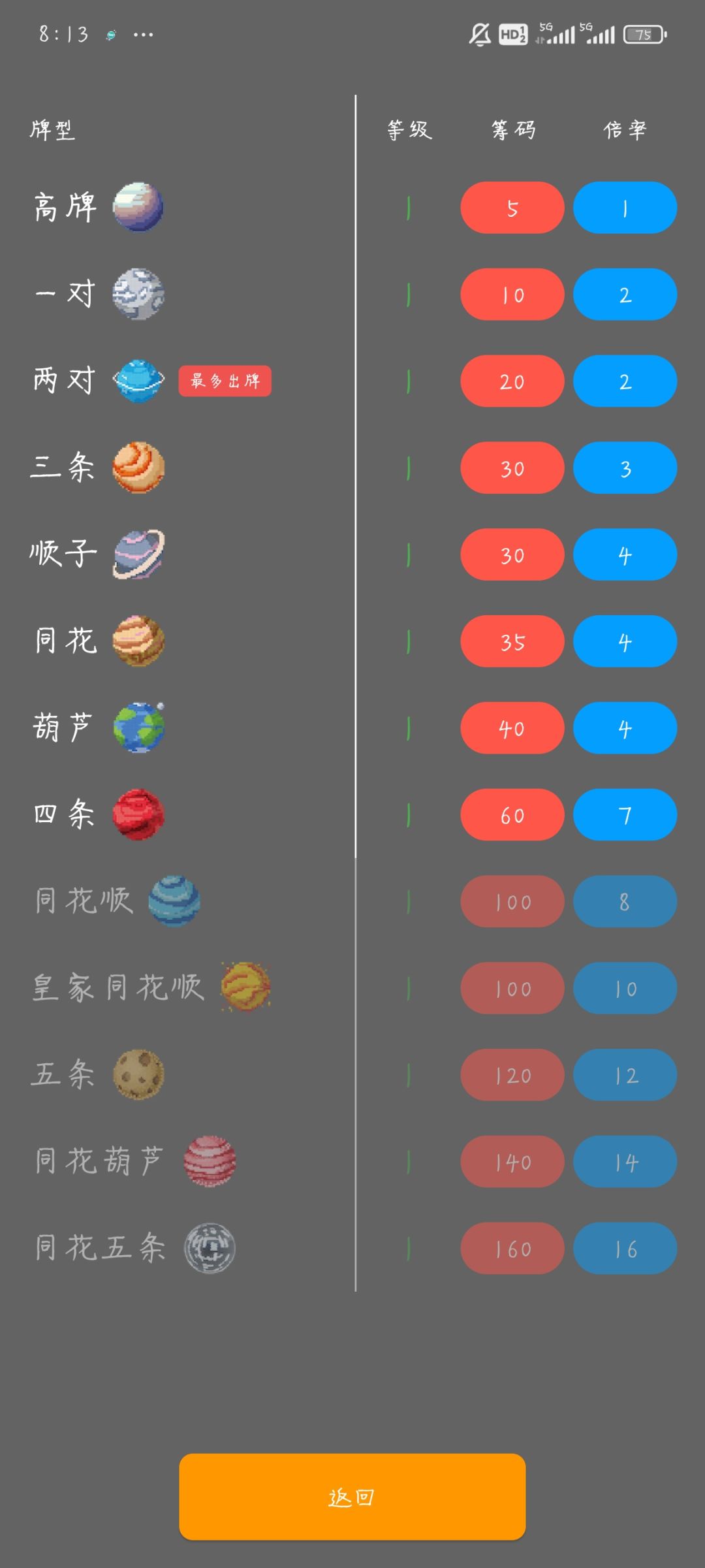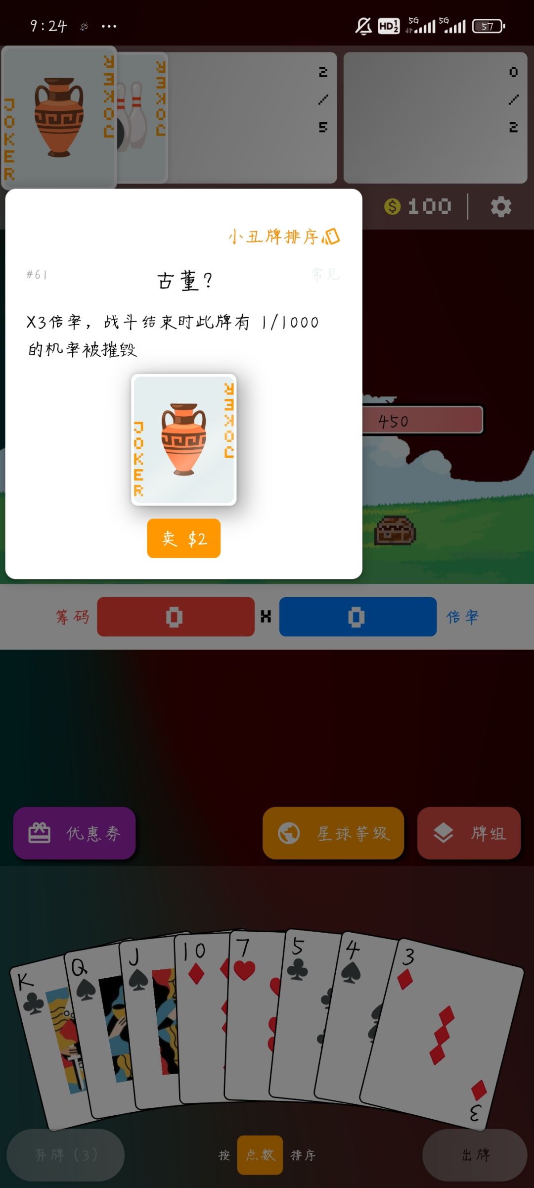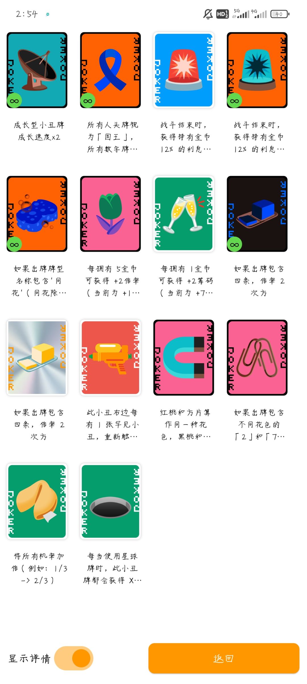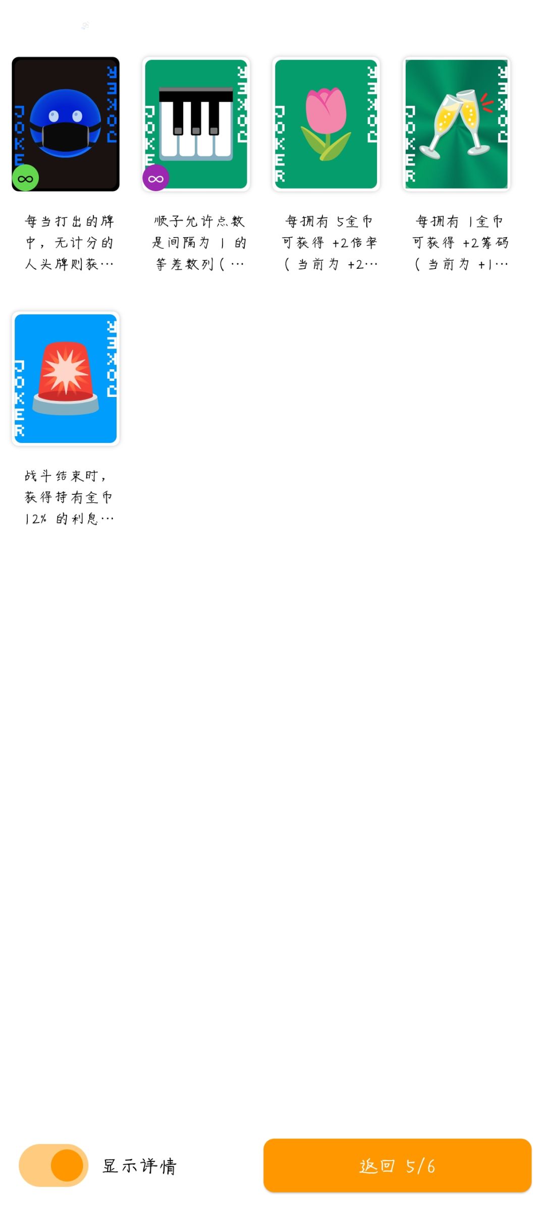 其中前期来说单卡最强的就是,第一排第二个蓝丝巾(效果是,JQK视为同一种牌,1-10,全部视为10),随便出五张数字牌就是五条(10 10 10 10 10)基础倍率120✖️12,前期拿到就稳了,但是要五条,数字牌和JQK就不能同时出了