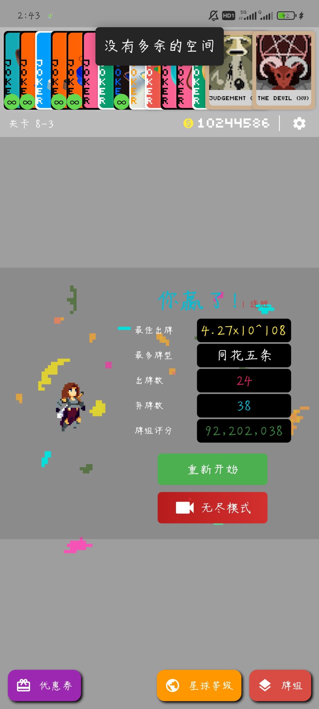 其次是,五条还可以同花五条,就是同一个花色任意1-10(jqk在手里会非常卡手牌,拿到丝巾就开始删这仨了)