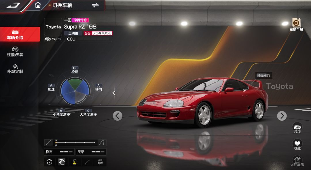 车手们前往车辆收藏即可查看车库中所拥有车辆的目前性能评级以及车辆最大性能评级,能够让你在选车时根据车辆性能评分一键锁定“潜力股”,也能够有选择地对车辆进行性能改装,再也不用为复杂的数据对比发愁~(本次调整仅针对评分和评级体系,车辆的实际性能表现完全不受影响,大家可以放心体验!)