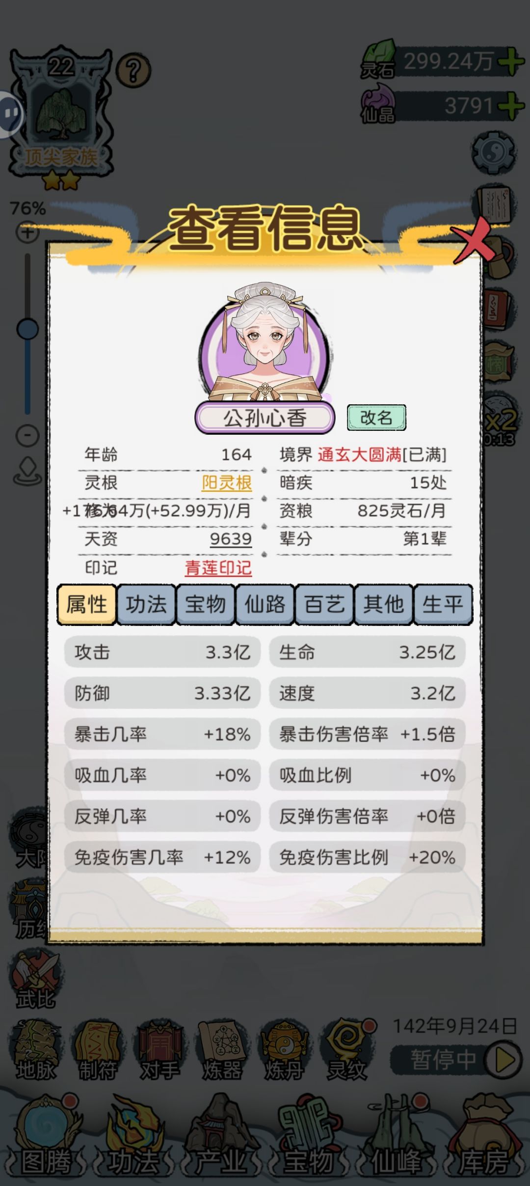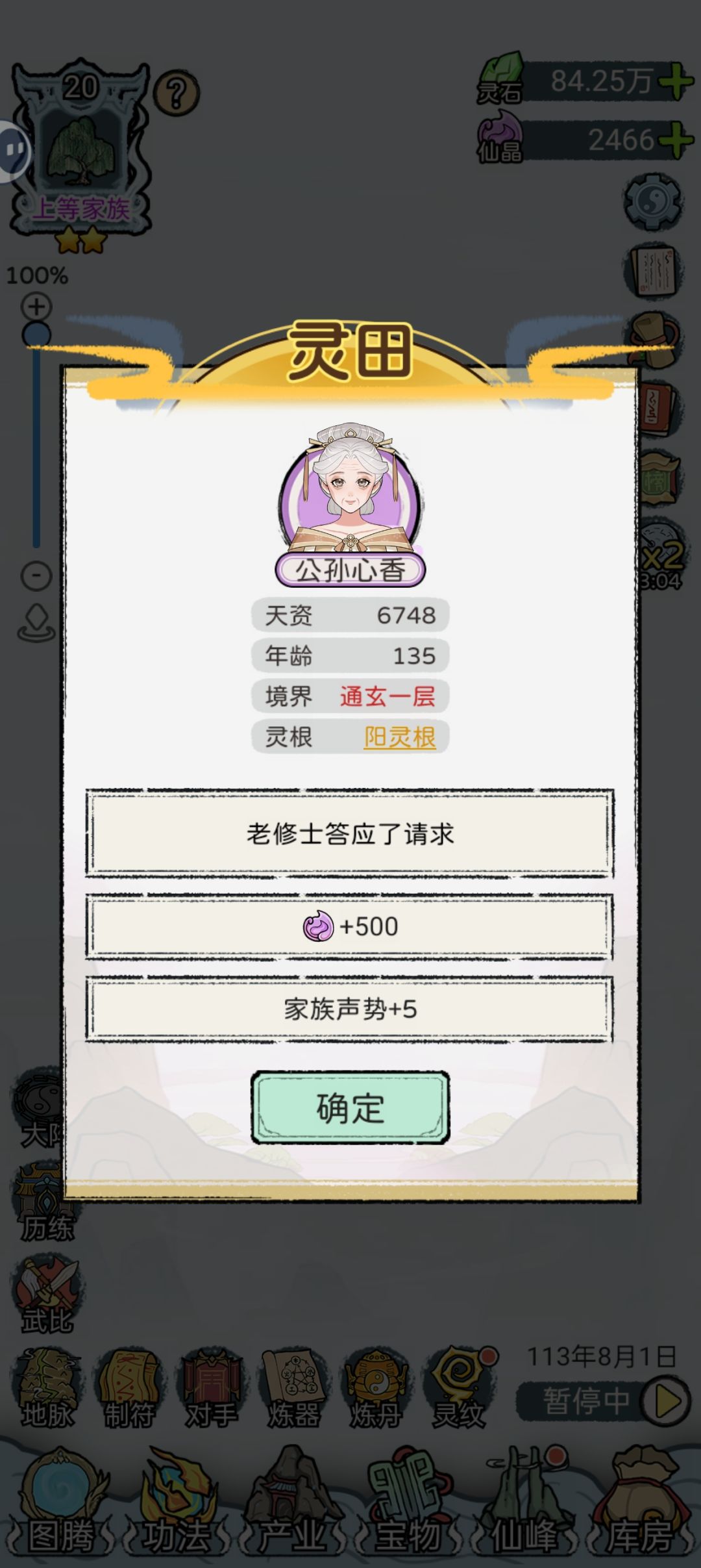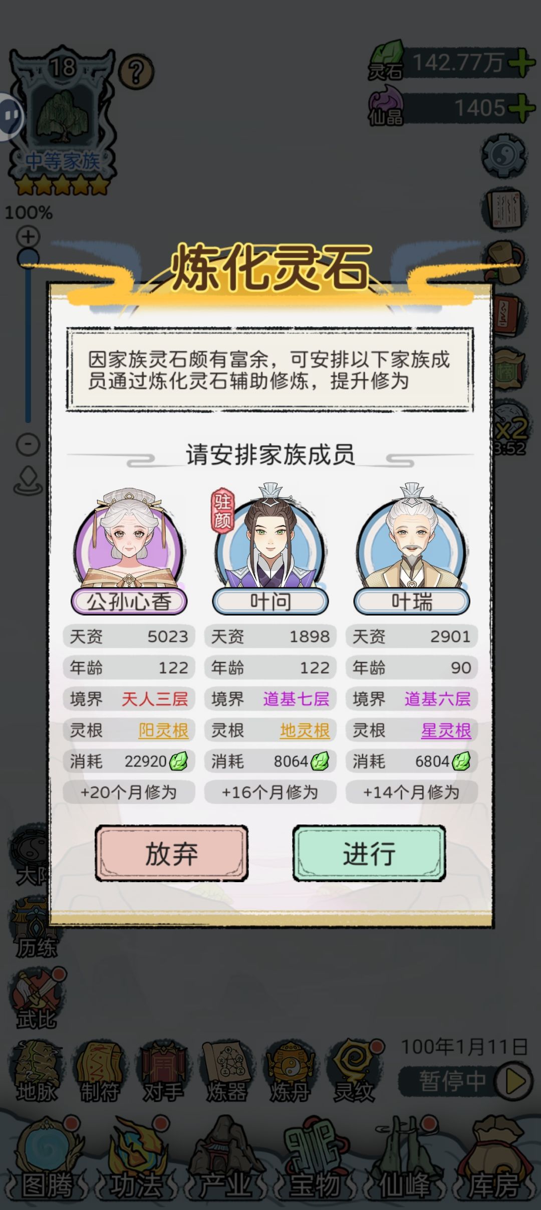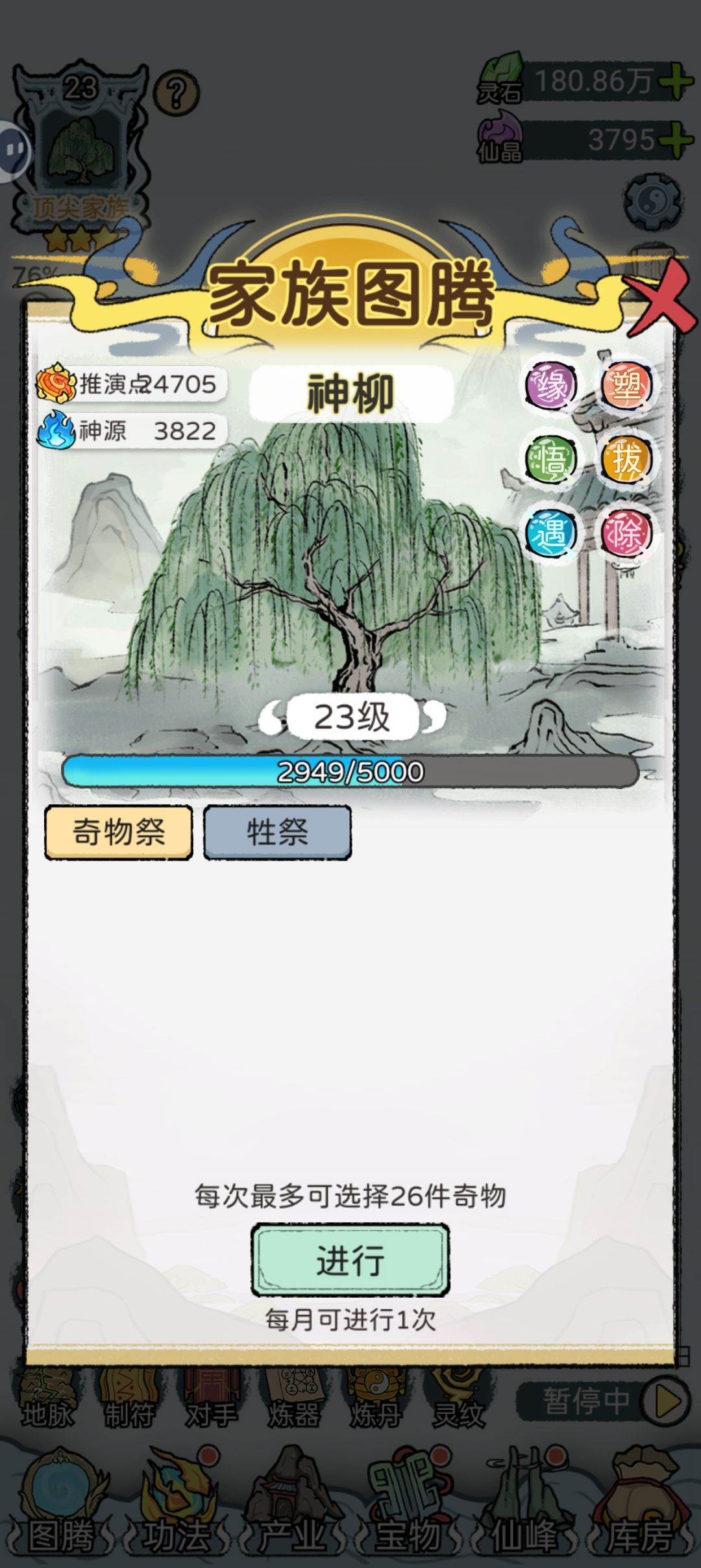 6.对手能打就打,注意用神源点先偷了灵宝再打,这样收益最大化。神源充足的时候也可以收一下产业再打。不用怕打输了调家族威望,威望低了反而会增加 威望奇遇的概率,会获得更多的仙晶或者兽尸。