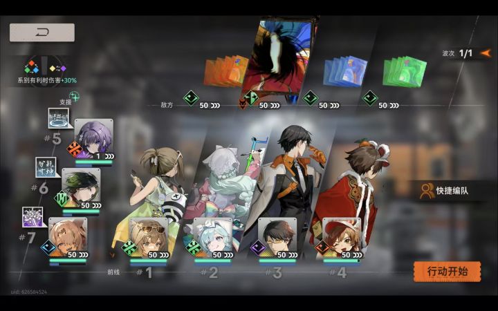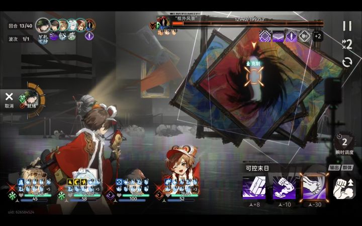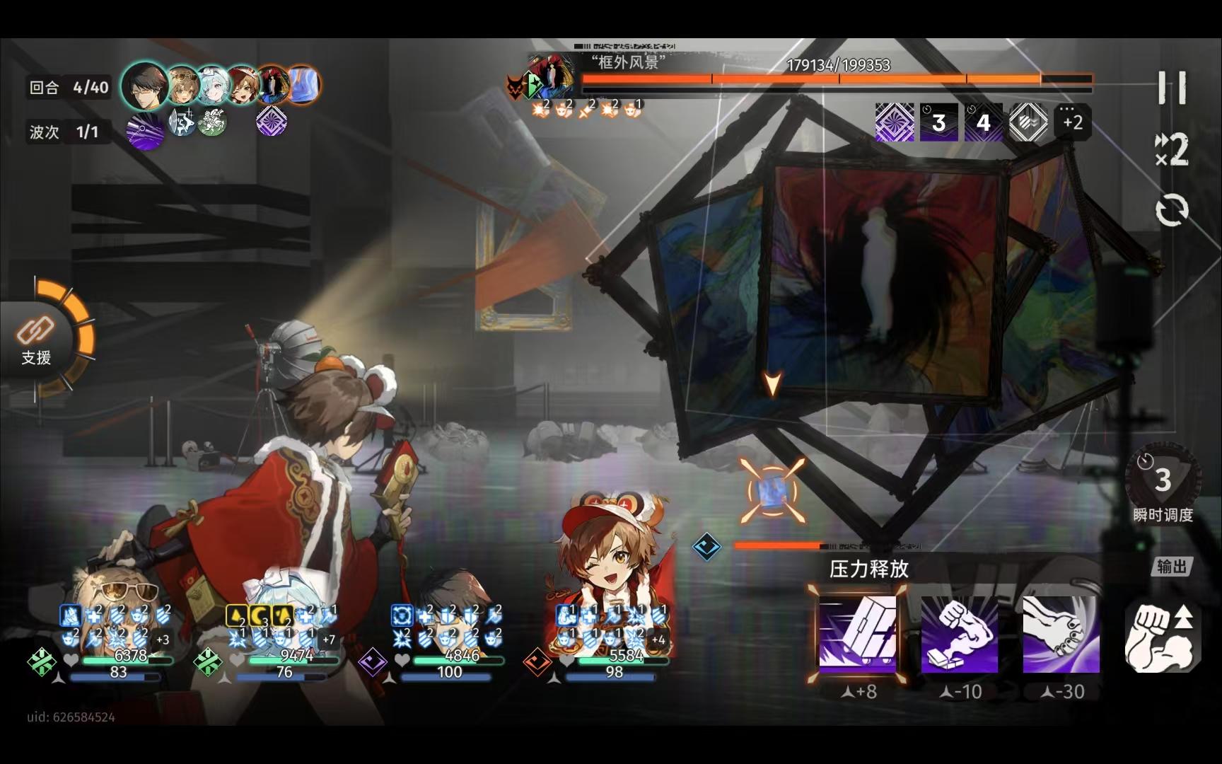 前置把所有人物的能量打满支援技跟组长技能也打满。月白 跟 朝颜 给千秋上buff ,不要去普攻boss,boss会回血,千秋则一直开大,骐骥在boss第一次开大以前一直放二技能,当boss开完第一次大以后,在一直普攻boss。当boss开完第一次大以后,出现红色方块退出重新打,出现其他两个方块可以继续打。当boss放大的时候,在放支援技 银峰 / 巫 ,站位如图所示。