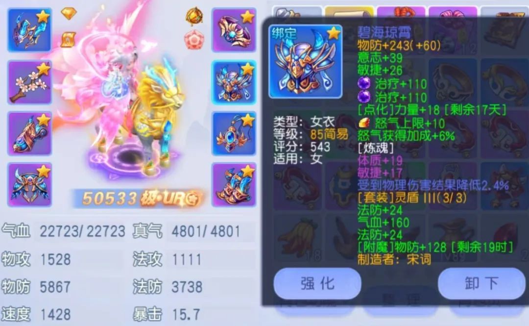 炼魂: 炼魂属性中,意志19,敏捷20,表现不错。但特效“药品治疗效果提高3%”实用性欠佳,建议重新洗炼以优化。