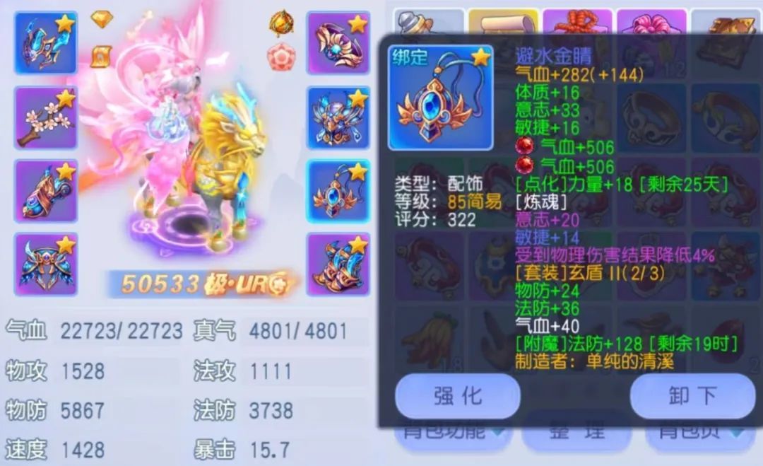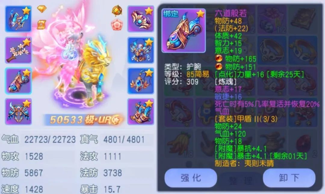 炼魂:炼魂属性意志17,敏捷16,表现一般,提升空间较大。特效为5%神佑,建议重新洗炼以优化。