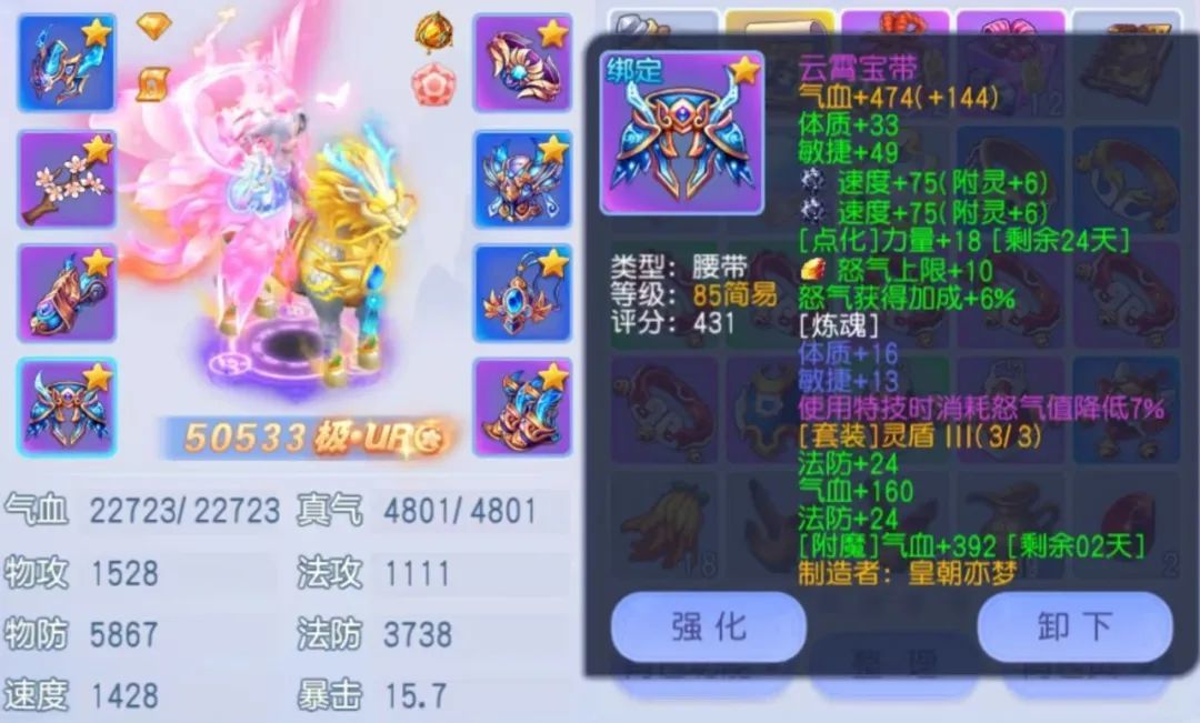 基础属性:再看大佬的腰带,紫色简易品质,气血加474,距满值480仅差6点,基础属性表现优异。