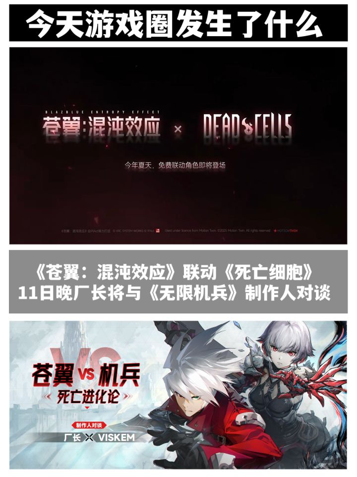 4月10日,在「iii计划」线上游戏展示会上,《苍翼:混沌效应》官方正式公布了在今年夏季游戏与《死亡细胞》联动的消息,会推出《死亡细胞》免费联动原型体(以及一些新东西),联动前还会在PC端加入一机双人的玩法。