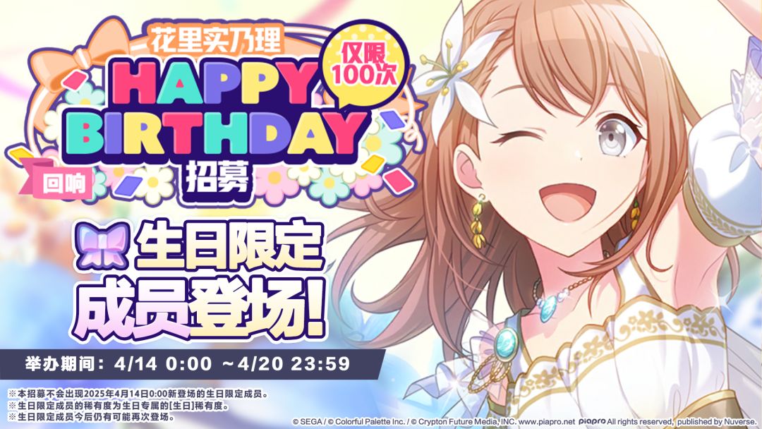 4/14 00:00起将举办「[花里实乃理] HAPPY BIRTHDAY 2025招募」、「[回响][花里实乃理] HAPPY BIRTHDAY Stamp招募」、「[回响][花里实乃理] HAPPY BIRTHDAY Flower招募」🎉