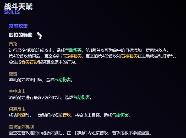 固有技能技能一:夏空及其合奏音影的音律独奏能为附近的角色提供 12%的气动伤害加成,也就是他的普攻第四段和那个绿色的影子,各提供 12%的气动伤害加成,总共 24%。技能二:重击四拍重奏(也就是共鸣回路那个可以聚怪的重击)伤害提高 30%。变奏技能入场造成气动伤害,释放变奏技能后,夏空的普攻会从第三段开始,能更快打出第四段普攻。演奏技能使附近范围内的目标受到风蚀效应的伤害加深 100%,这个是给怪挂上的受到的风蚀伤害。而菲比的演奏技能是给角色自身挂上,像散华和洛可可这种,直接给角色挂上伤害加深,并且菲比 炎奏技能的 100%光照效应伤害加深,切换至其他角色依然生效。所以目前夏空的演奏技能伤害加深,打冥歌海墟基本上用处不大,因为只能给一波怪加上 100%的风蚀效应伤害加成,打深塔倒是没问题。就看后续会不会改成跟菲比一样的。不过她这个技能描述有点抽象,还有一种可能就是它是一个类似于领域的技能,在附近范围内这个领域里面,只要有怪,该怪受到的风蚀效应伤害都会加深 100%,持续 30 秒。
