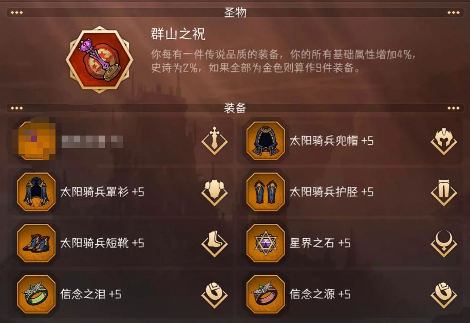 装备:钱牧主打一个生存,使用【群山】圣物+太阳骑兵套装,尽量别用输出套。