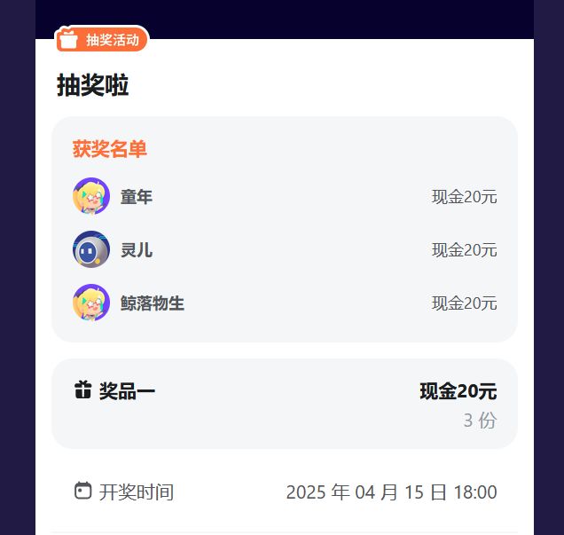 随机抽选3位修仙者:20元现金奖*1(随机抽取)