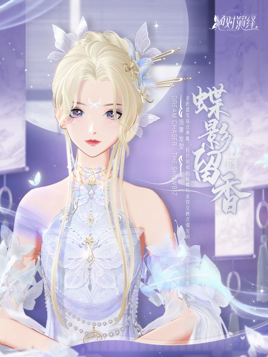 以轻纱制成的蝴蝶与金钗交映点缀金色盘发,灵动而不失优雅。整体裙装上身后的你宛如轻逸绝尘的月宫仙子,脚下是祥云缭绕,身后是清辉月光,好一副古典画卷。