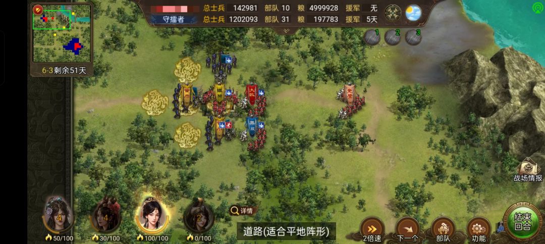 除此外需要注意,敌方主将第九天出来,对攻坚组机动性有一定要求,推荐带疾行和水阵,并且队伍中有人带布阵技能。