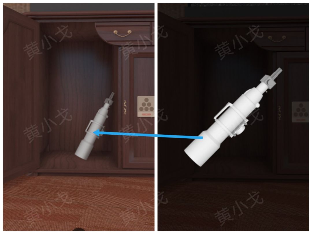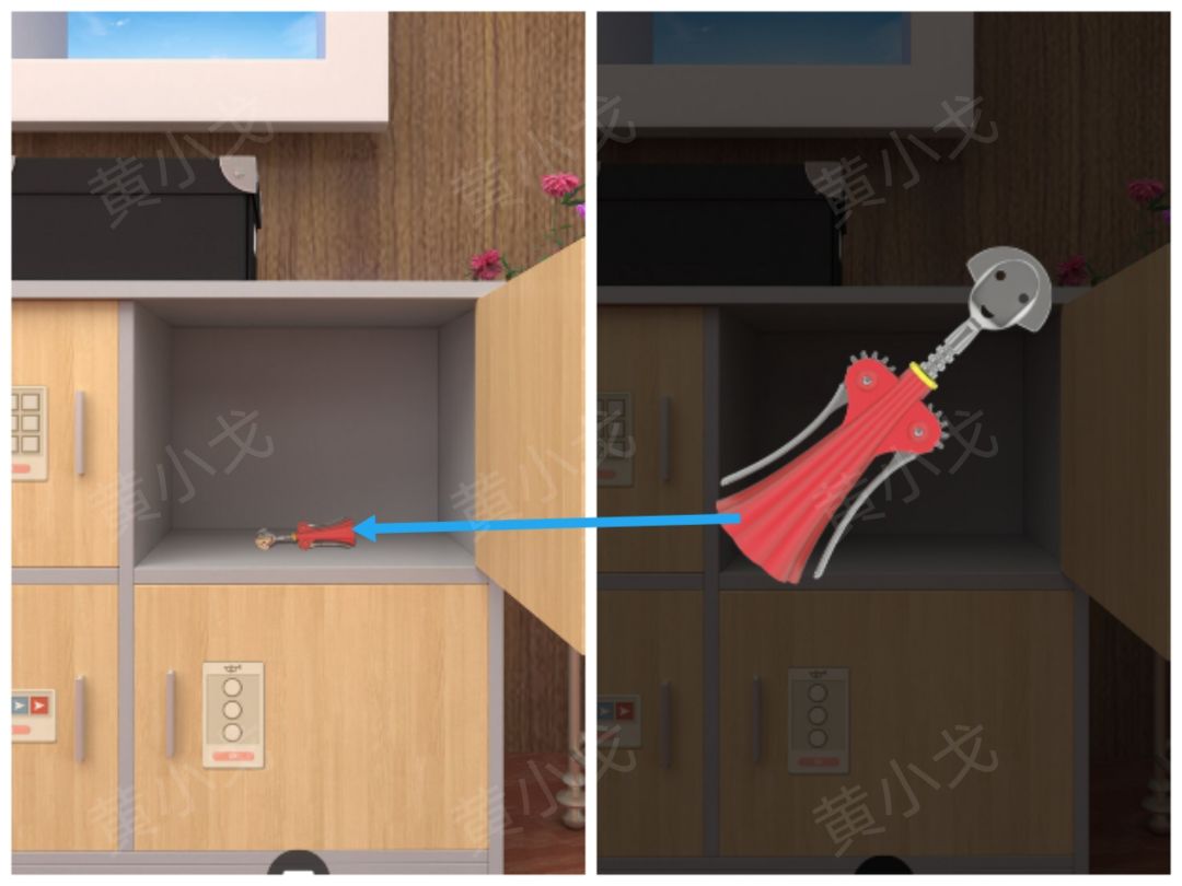 10.点击柜子左下角柜门上的密码锁,根据上面的小提琴图案线索,结合[表演厅]小提琴手拉琴的高低顺序,按正确的顺序按下密码锁上的按钮