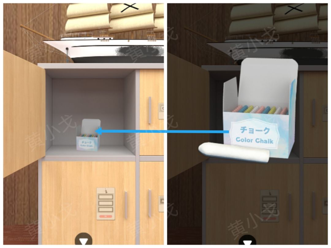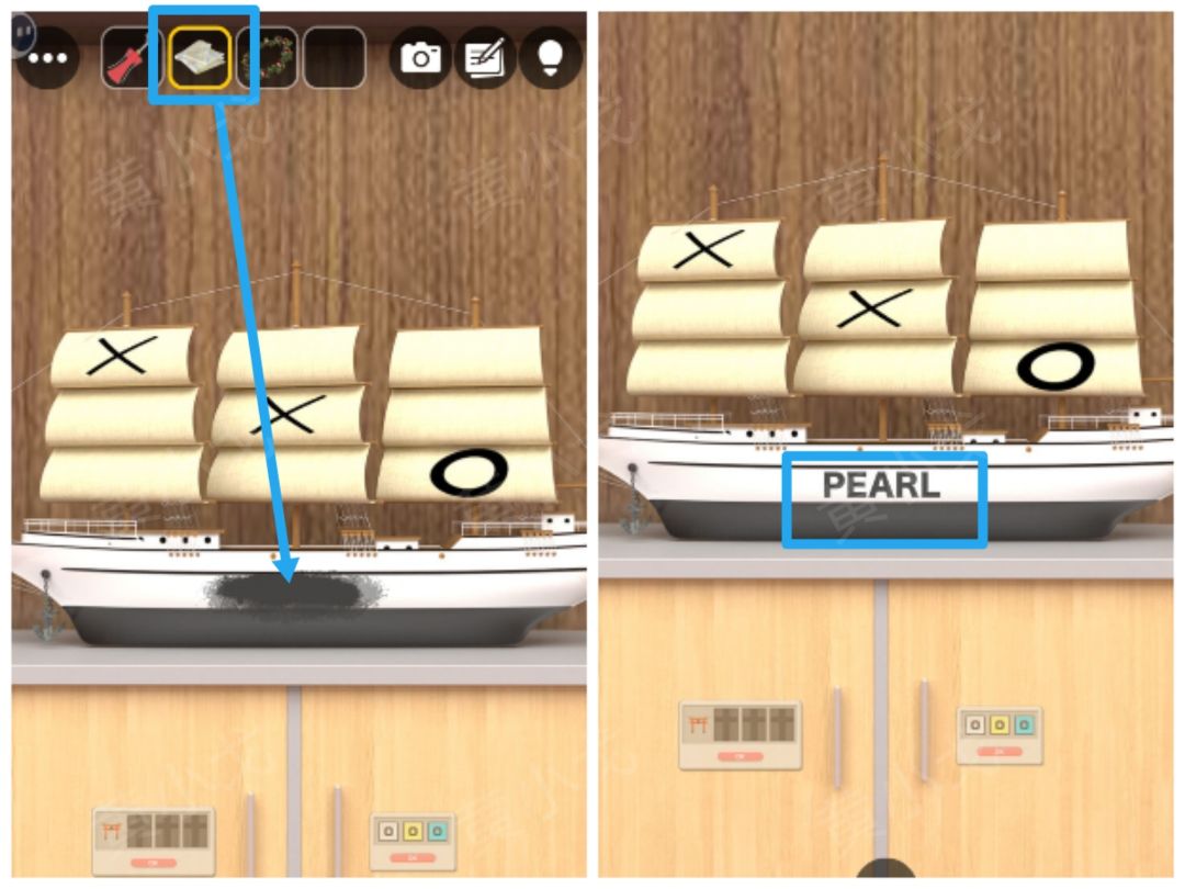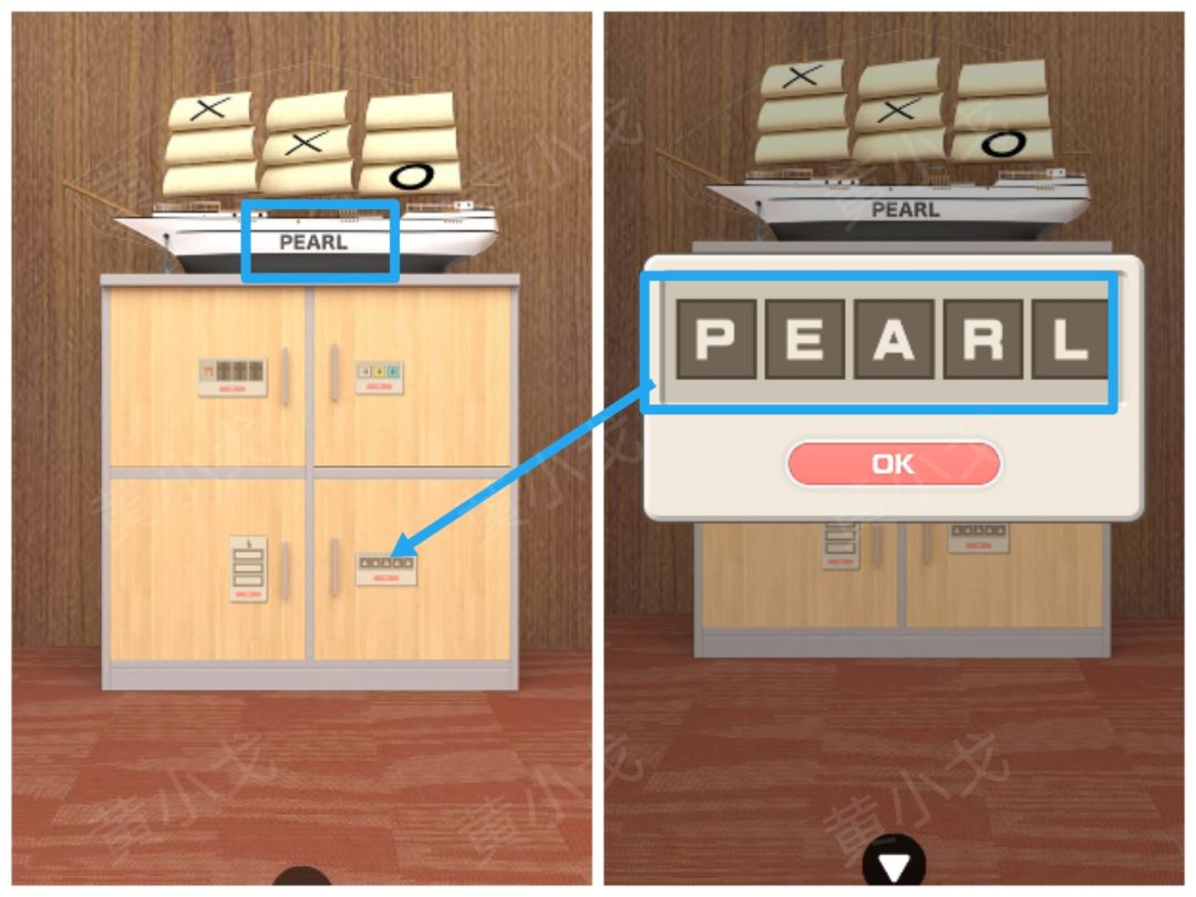29.点击柜子右下角柜门上的密码锁,根据帆船模型上的线索,输入密码:PEARL