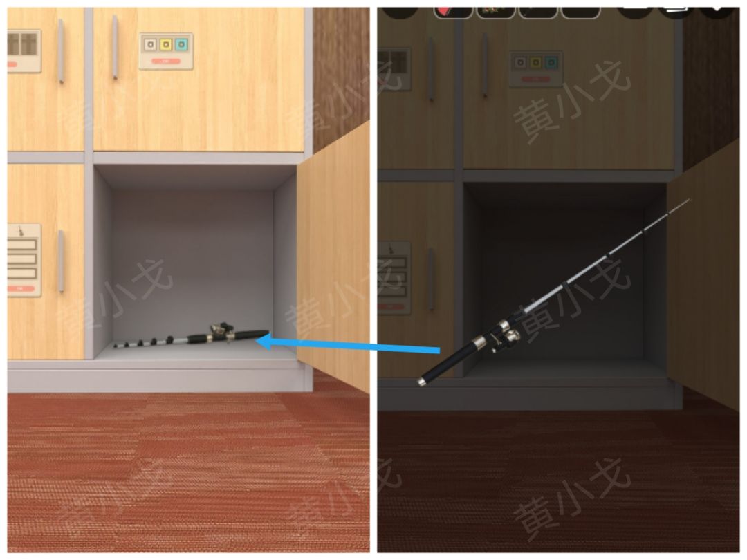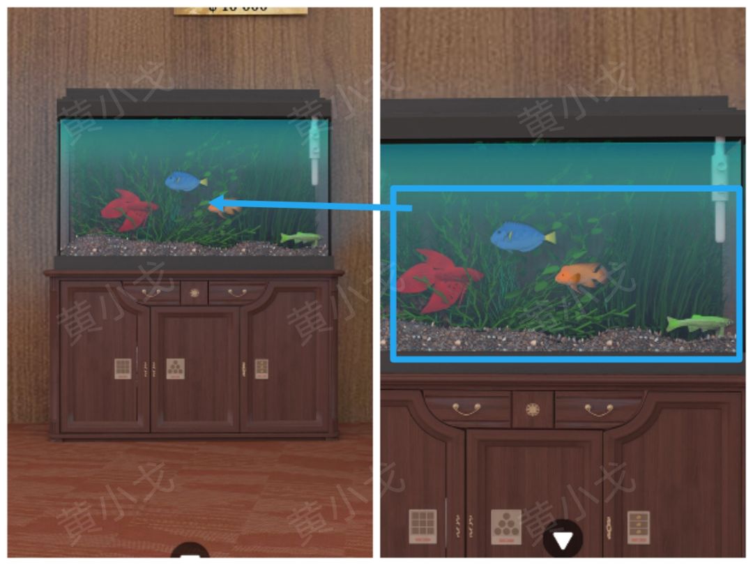 20.点击柜子左下角柜门上的密码锁,根据上面的颜色提示,结合[登记区]鱼缸里的鱼的颜色及朝向线索,调整密码锁