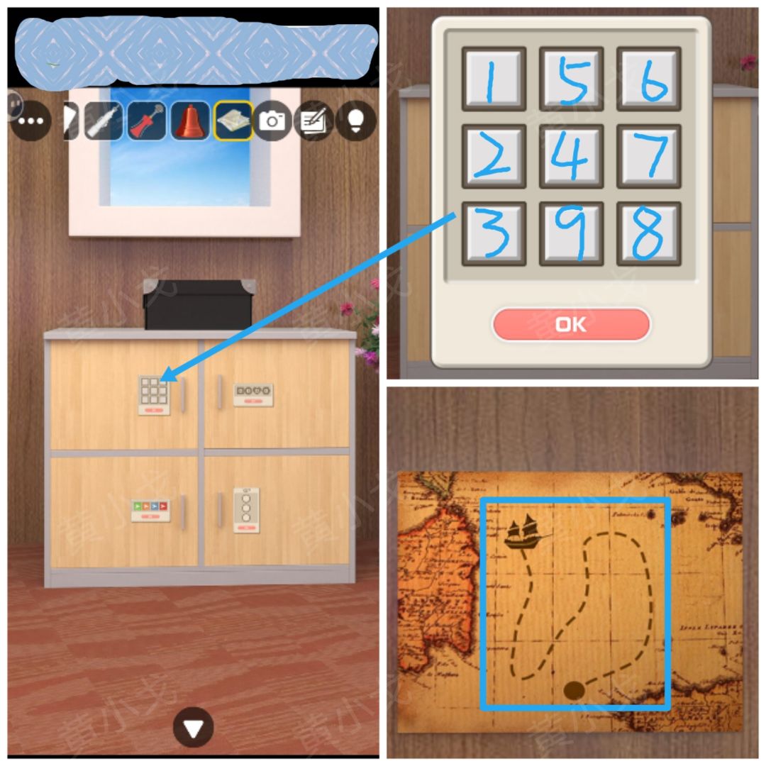 22.点击柜子左上角柜门上的密码锁,根据[登记区]地图上的路线线索,按顺序按下九宫格按钮
