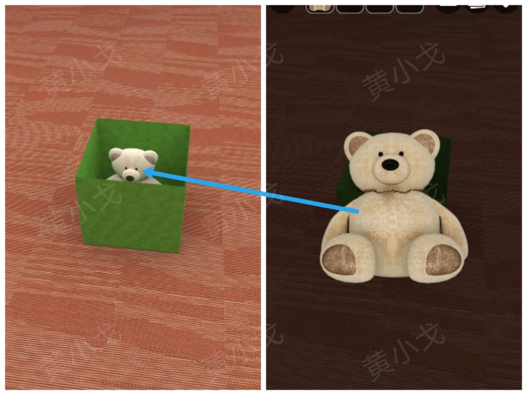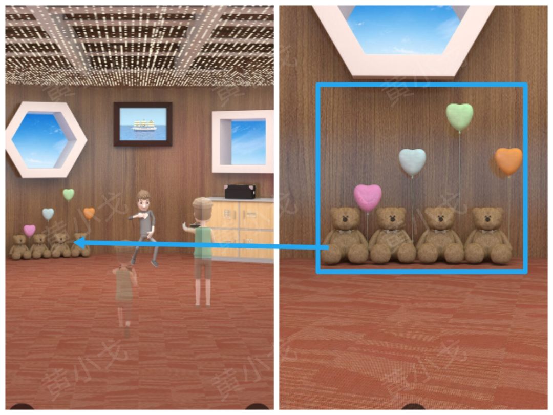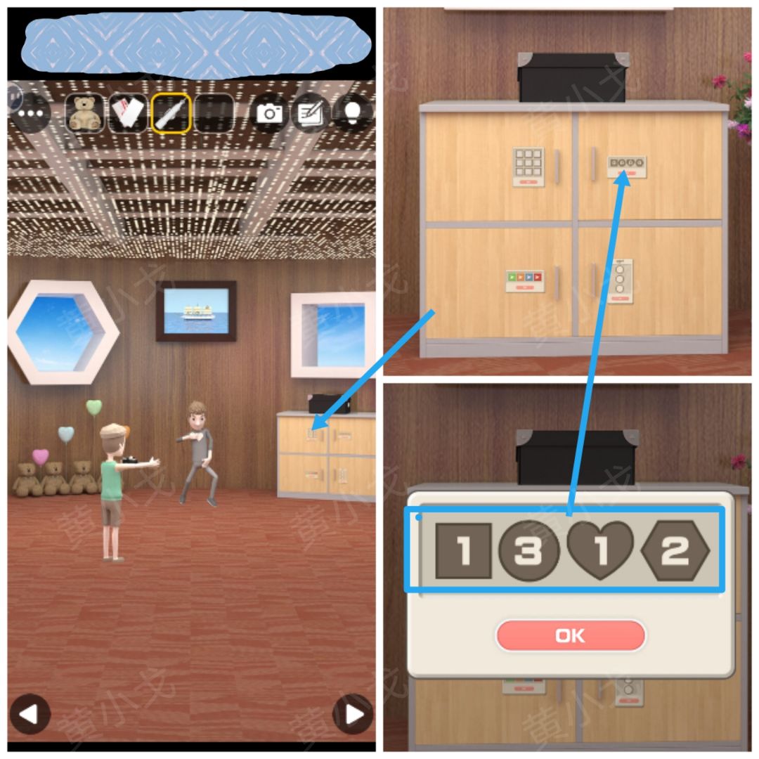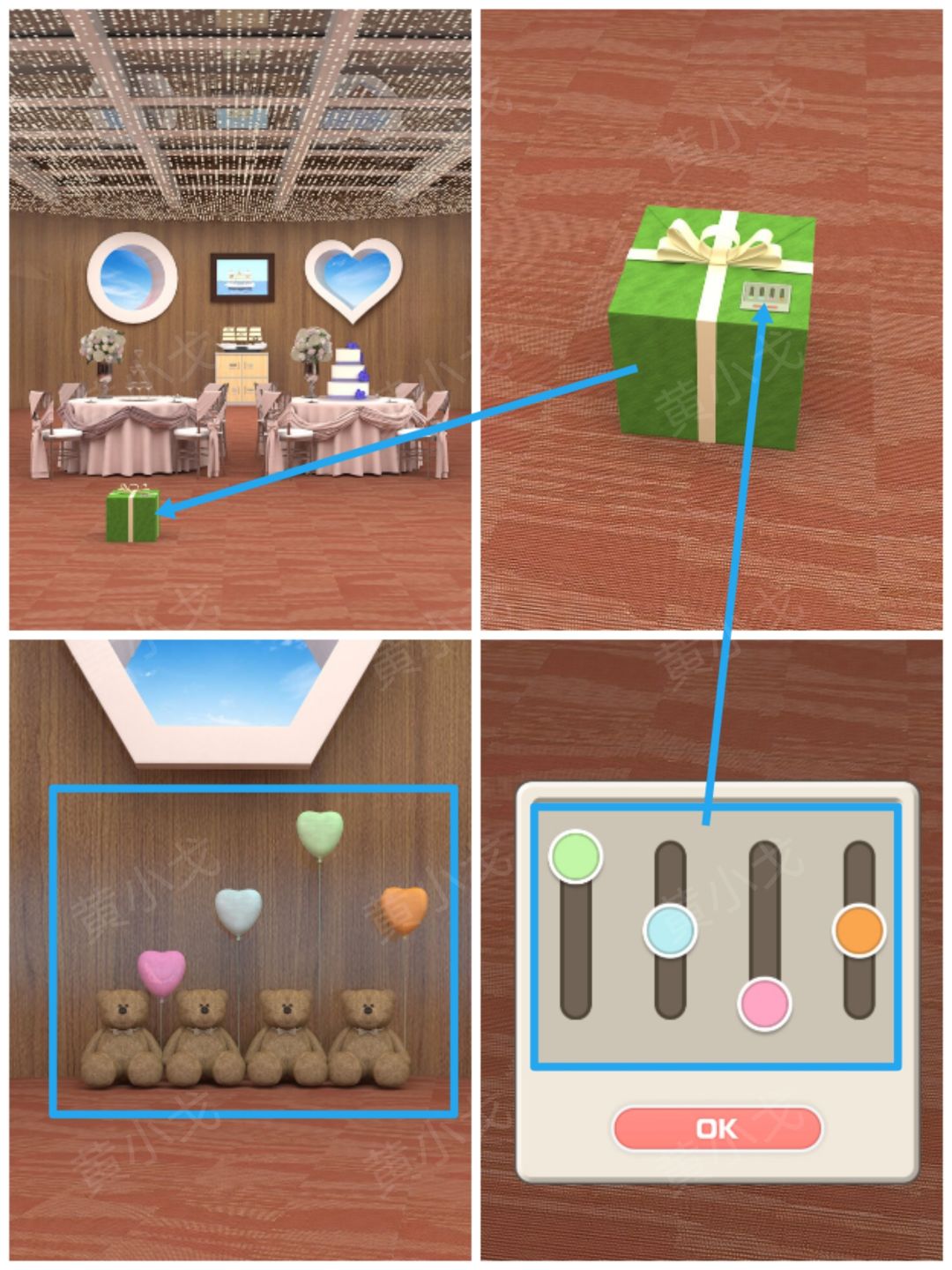 5.点击地上的绿色礼盒,根据上面的颜色提示,结合[打卡点]场景小熊拿着的气球颜色及位置线索,调整密码锁
