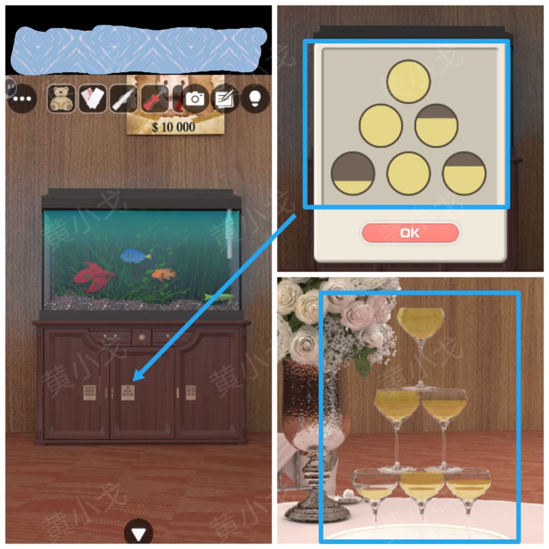 31.点击柜子中间柜门上的密码锁,根据[宴会厅]场景杯子中香槟的容量线索,调整密码锁