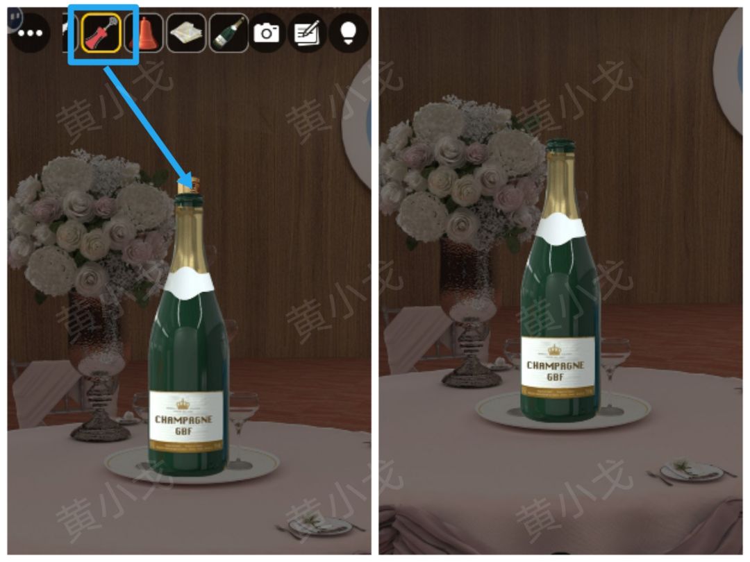24.用【开瓶器】打开【香槟】的盖子,获得【开好盖的香槟】