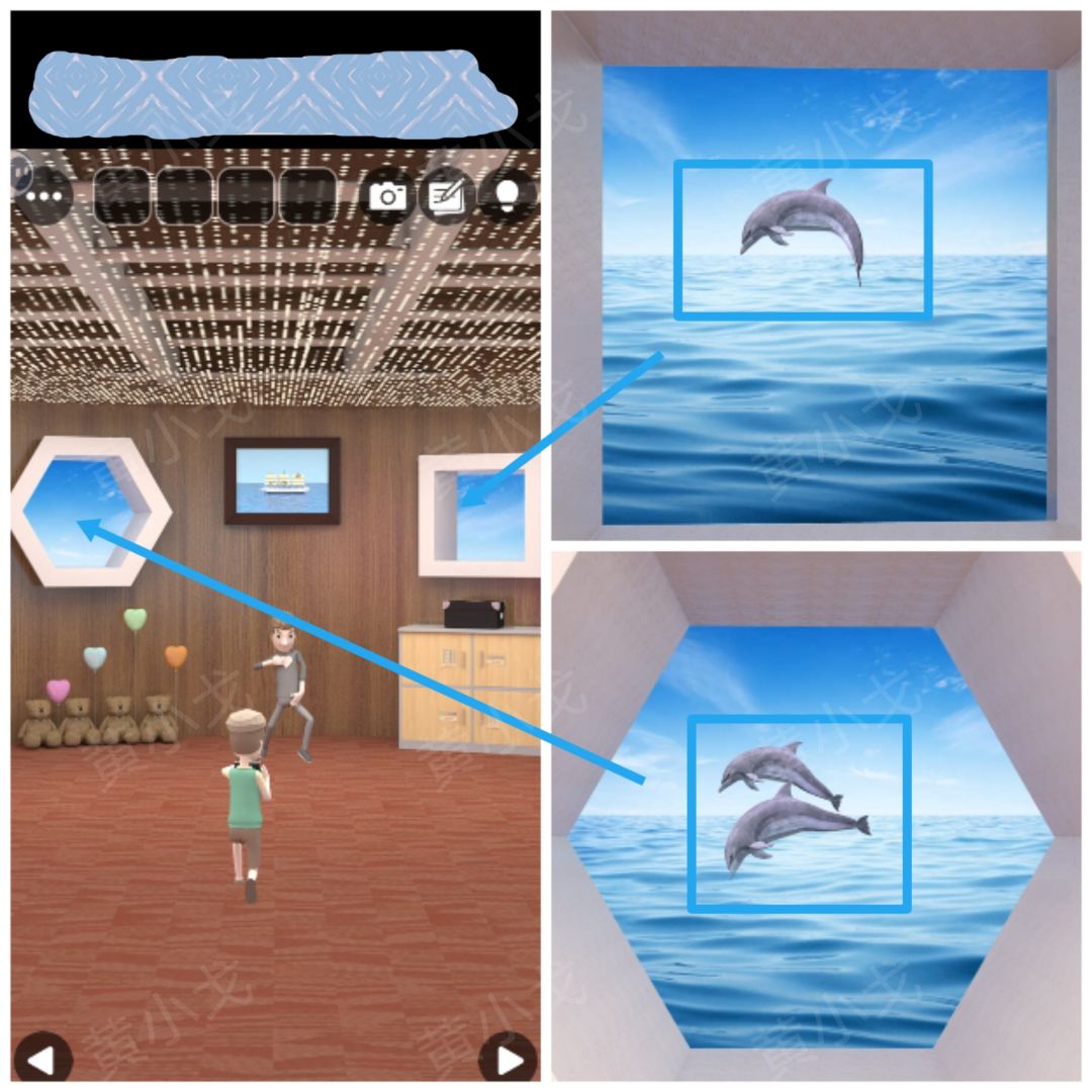 🔶[打卡点]窗户的形状和窗外海豚的数量:六边形-两只、正方形-一只