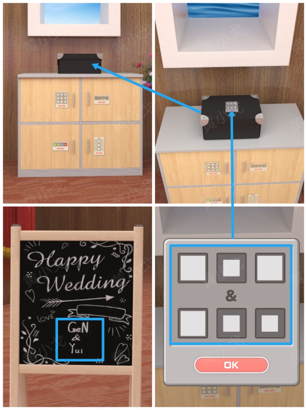 27.点击桌子上的礼盒,根据[婚礼现场]通过望远镜观察到的线索,调整密码锁