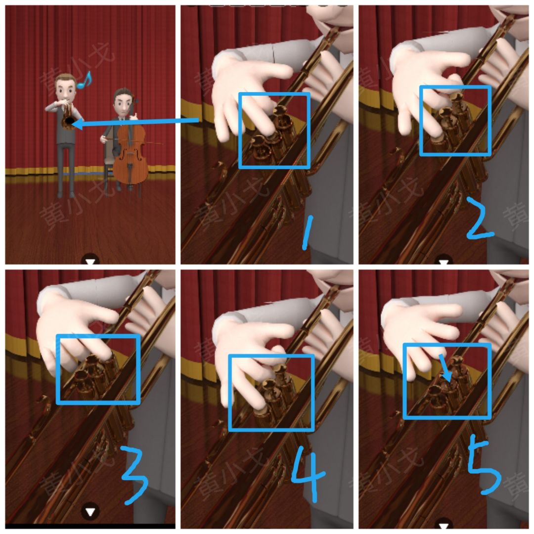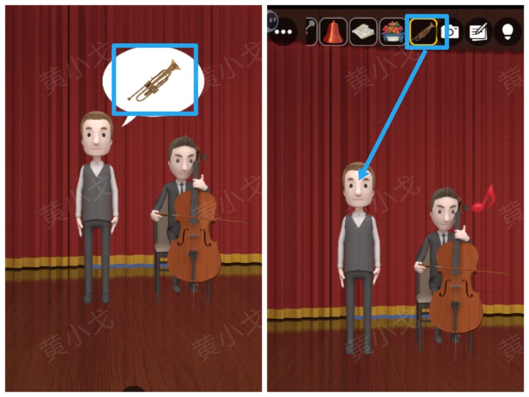 5.点击舞台左侧的演奏者,拿【小号】给他