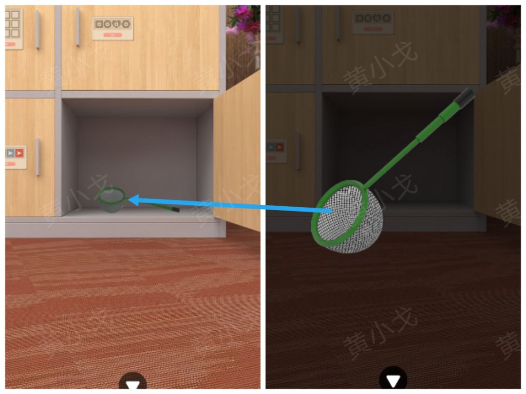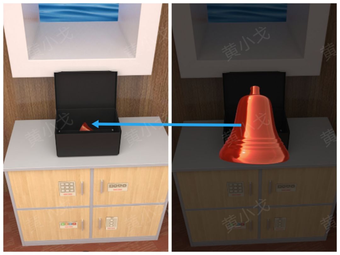 8.点击柜子上的盒子,根据上面的符号提示,结合[表演厅]场景小黑板上的线索,调整密码锁