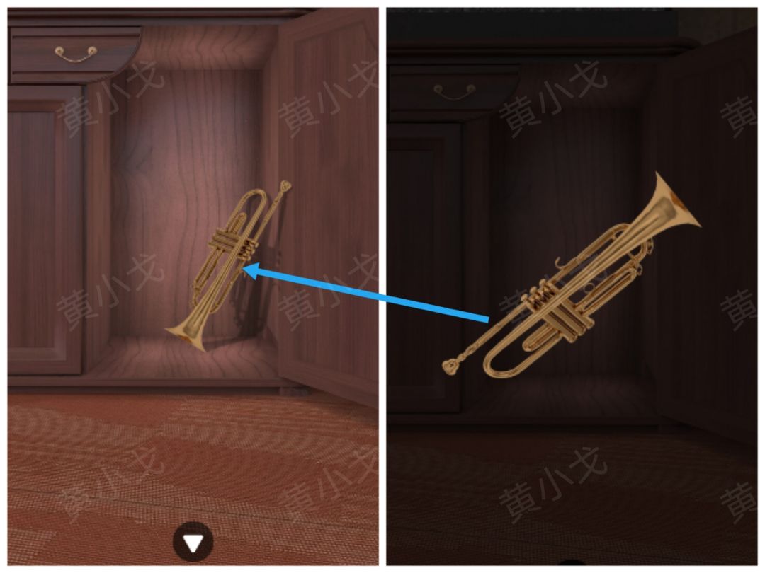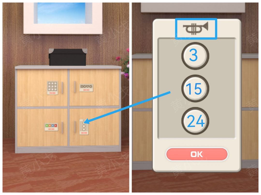10.点击柜子右下角柜门上的密码锁,根据上面的小号图案提示,结合[表演厅]演奏小号的顺序,按顺序按下对应的按钮