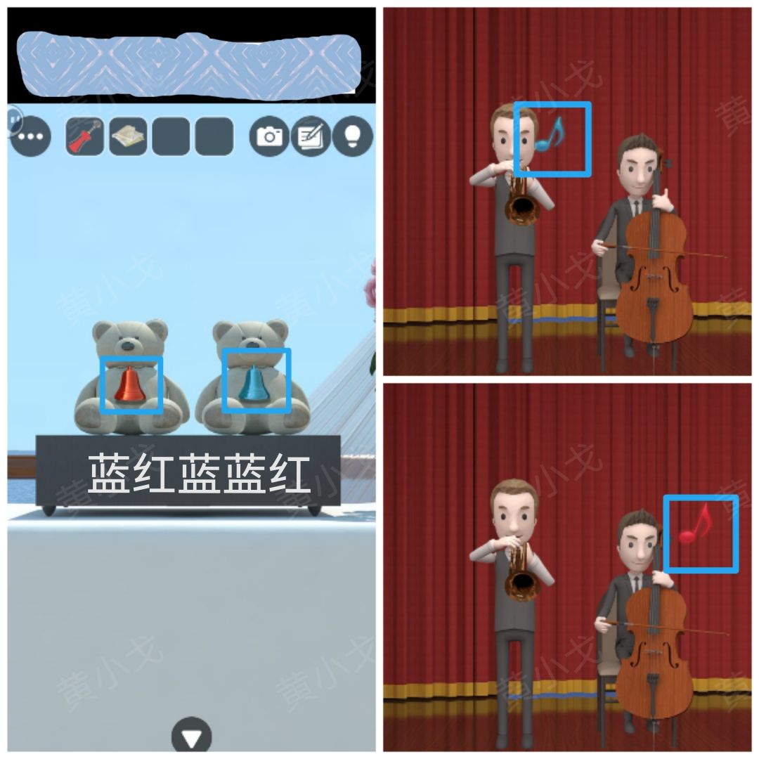 20.根据[表演厅]两位演奏者演奏的顺序,按顺序点击玩偶熊身上对应颜色的铃铛